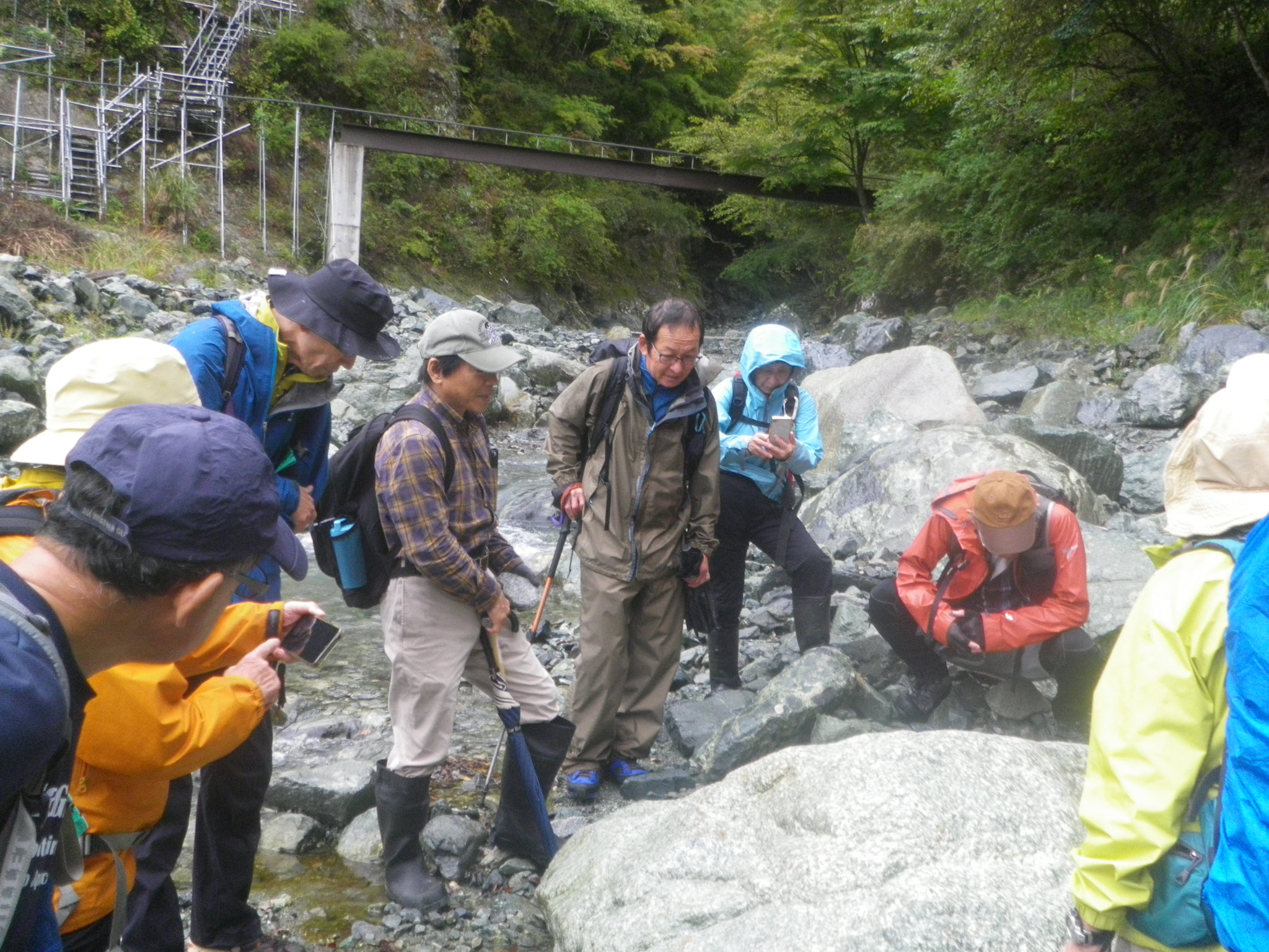10/19 天候が不安定ながら〈やどりき水源林〉の寄沢に於いて岩石・丹沢の成り立ち・地層などについて外部講師による講習会を実施しました。