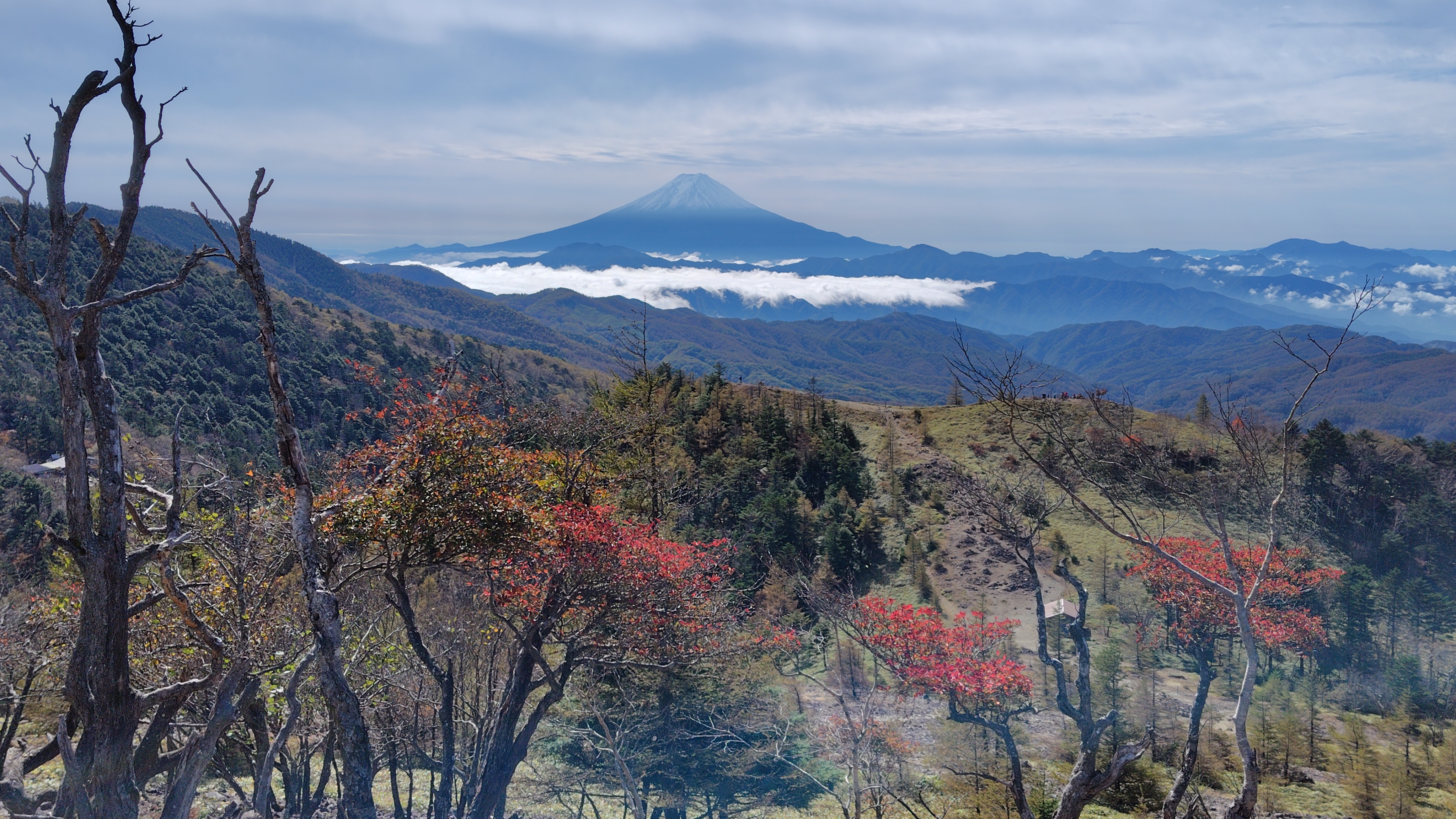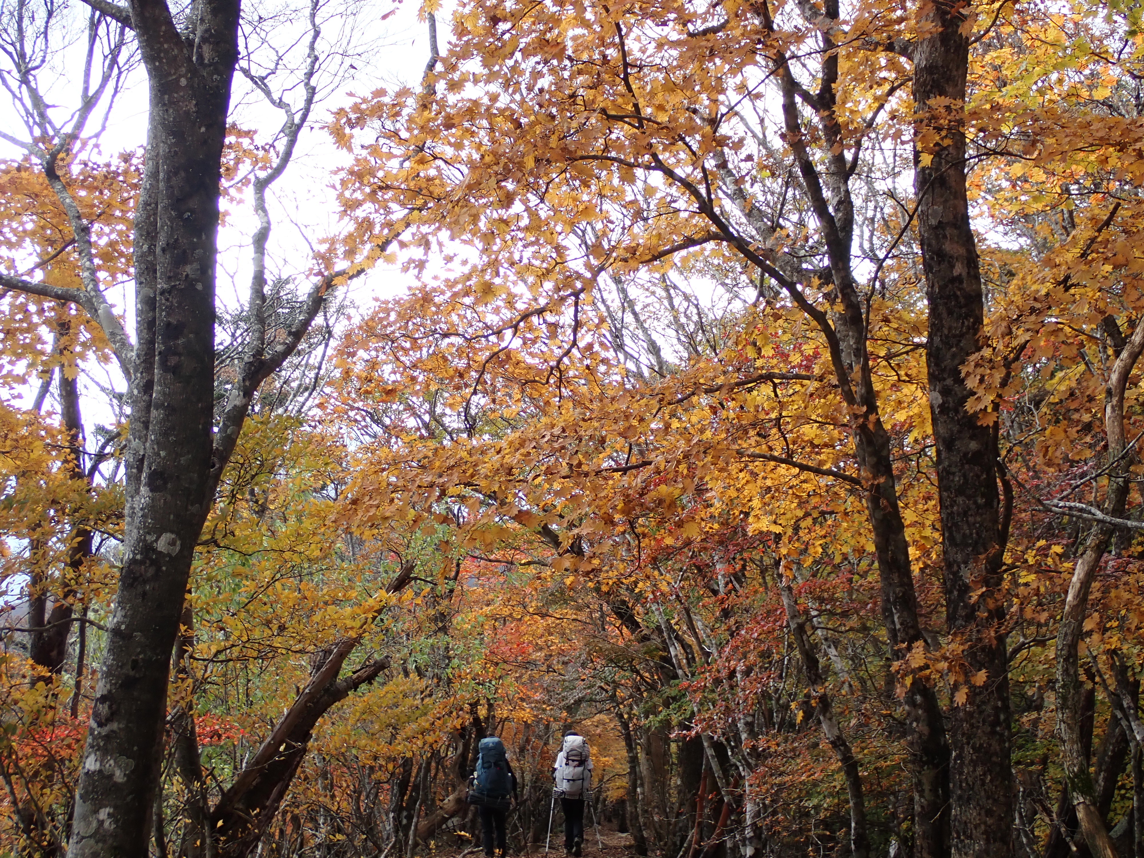 10/30~31 H企画部山行で御坂山塊の黒岳に行ってきました。朝、河口湖駅に降り立つとそこはびっくりするほど大勢の外国人観光客でごった返していました。初日は天下茶屋から登り始め、黄葉した木々の間から富士山&河口湖を眺めながらの気持ちの良い稜線歩きを楽しみました。この日の宿はリーダーだけが知る『すずらん荘野営場』。木立ちに囲まれた静かで居心地の良いキャンプ場でした。2日目はすずらん峠まで登り返し、その後は緩やかなアップダウンを繰り返しながら長浜バス停に下山しました。曇り空で、楽しみにしていたツインテラス(新道峠)からの絶景は、残念ながら見られませんでしたが、来春、すずらんが咲くころにまた来ようと、次回のお楽しみとなりました。