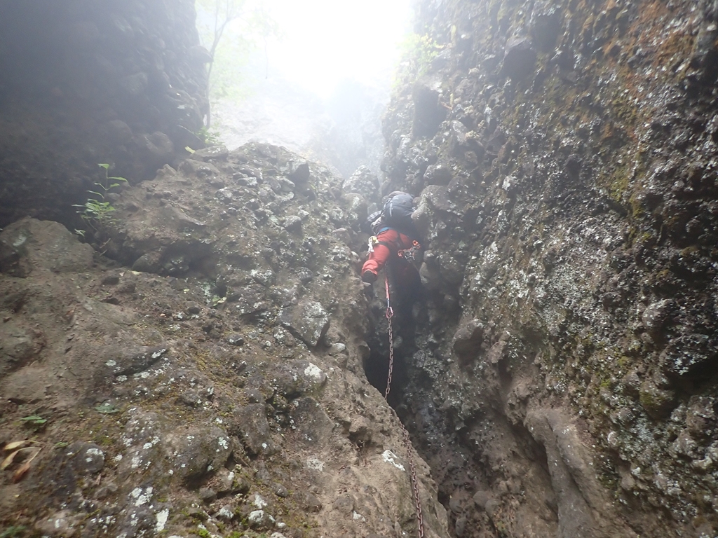 山急山と違い、岩峰取り付きまでは比較的歩きやすく岩峰直下までは容易なバリルート。ですが…、雄岳直下に立ちはだかるクサリ場は別世界で、狭いルンゼを直上する登攀力が要求されます。ヘルメット、ハーネス、ロープ等の登攀具は必須。無理に登ると降りられなくなります。こちらもガスで眺望は繰越となりました。