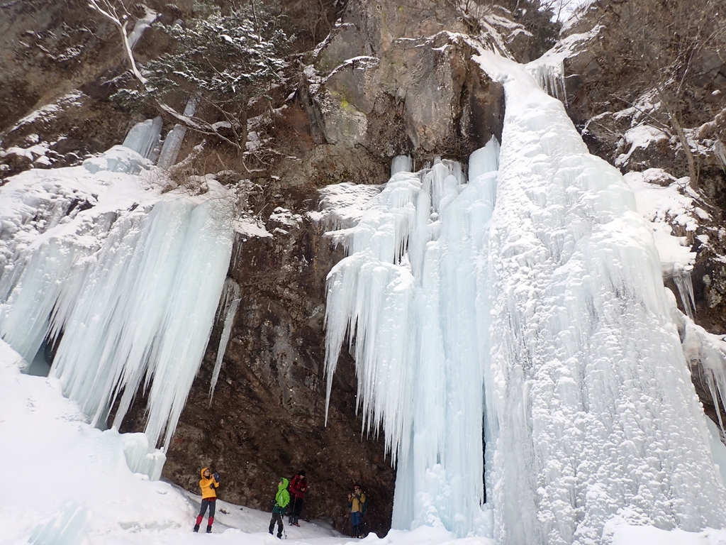 とは言え、瀑布直下に至る高巻きのルートは、雪と氷のアプローチ。落ちたら怪我では済まされないところなので、ピッケル、アイゼンを装着し、心して探訪してほしいと感じました。