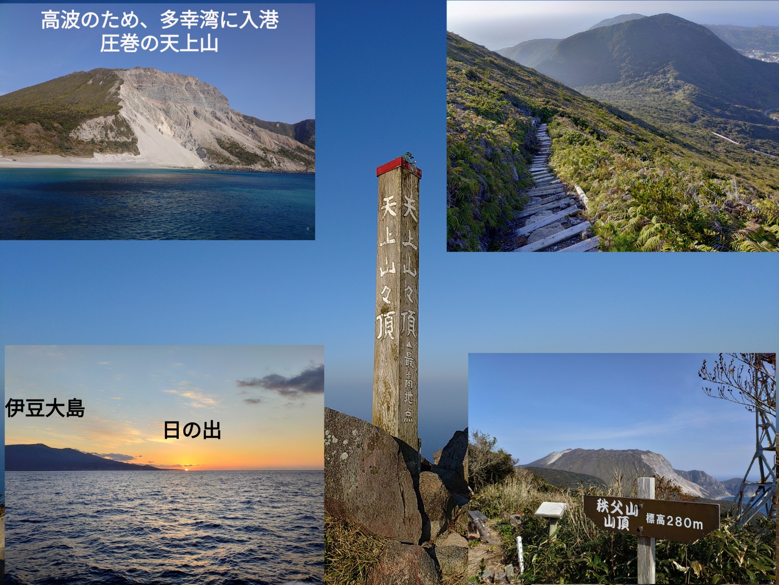 高波のため、接岸港や出航船の変更などがありましたが、秩父山や天上山、日帰り温泉を十分に堪能しました。天上山は帰りの船の変更により、複数のビューポイントをパスしたのが残念でしたが、多幸湾からの天上山の崩落斜面に圧倒されました。
