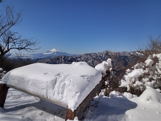 降雪直後の快晴の天候に恵まれました。丹沢・大山山頂から、山座同定を楽しみました。スマホアプリでは簡単にできるようですが、面白みを感じないのは私だけでしょうか。地勢図とコンパスを利用しました。下山にはケーブルカーの利用も考えましたが運休。バスも区間運休で、1時間程余分に歩きました。山名表示板はすっかり雪に埋もれていました。